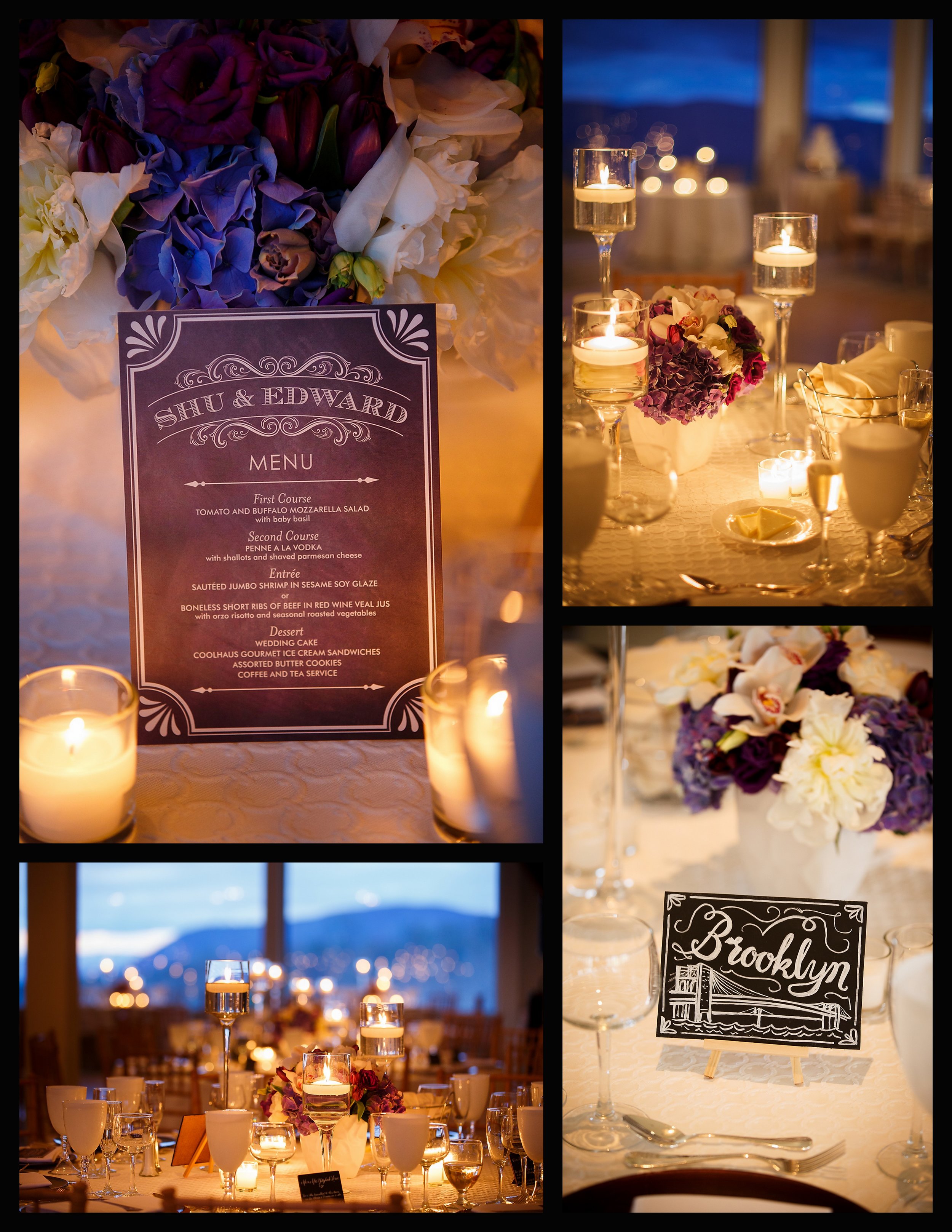 Shu & Ed were such a fun couple to work with! Their wedding took place at The Garrison, a lush, 300-acre property in the Hudson Valley. The couple held two ceremonies: one traditional American and one tea ceremony in the Chinese tradition. The bride wore two different dresses, a flowing white gown for the first ceremony, and a striking, red, lace dress for the second. In keeping with the rustic location, all of the signs for the wedding were beautifully done in chalk including the menus and program for the evening. The couple made their escort cards into a fun game for guests. Each card had the guest's name and two clues on it. Guests were challenged to match their clues to a table chart with different places significant to the couple's relationship with the guest. Once seated, guests enjoyed dinner under flickering candle light with the stunning Hudson Valley hills as a backdrop. Guests went home at the end of the night with gourmet ice cream sandwiches from CoolHaus.